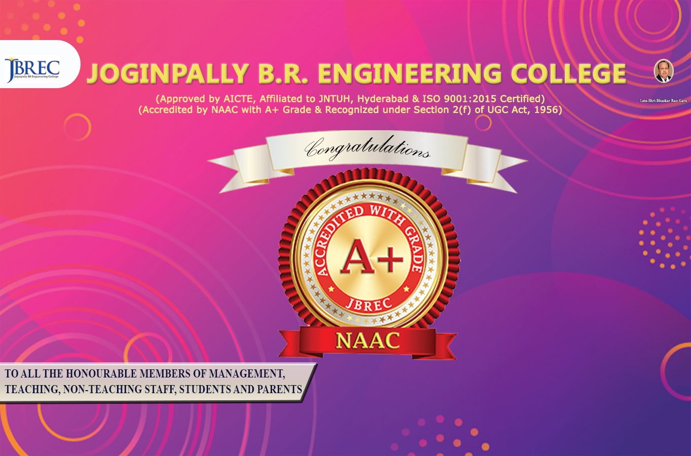 J.B.R.E.C was sponsored and established by J.B.R. Educational Society that had been a wide canopy, created by progressive, dynamic and productive management, for a lot of institutes marked for excellencies in academic records. It is recognized by AICTE and affiliated to JNTUH. The institute has strong vision, mission, objectives and the quality policy. Having been counted as one of the best institutions of its kind in Telangana, three batches of its students have successfully emerged out of its portals, after four years of rigorous training under the tutelage of the most venerable teachers, engineers and scholars, and are now ready to conquer the horizons and create new worlds.